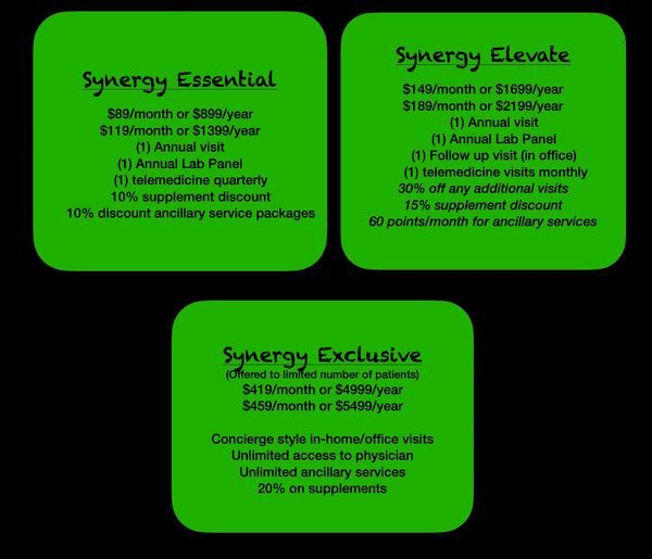 Synergistic Healthcare strives to offer individualized care with the utmost attention to detail while supporting your healthcare goals. Private practices are having to transition into annual membership models to compensate the physician and staff for numerous hours needed to advocate for your ongoing care. Insurance continues to limit providers and patients by denying coverage for medications, labs, and therapies creating endless hours of documentation providers must perform (prior authorizations, letters of medical necessity, etc). Business’s are implementing models charging monthly or annual fees to ensure the practice can operate successfully.